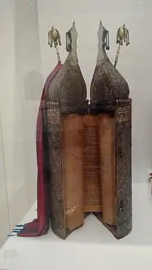 وفقًا للقانون اليهودي، التوراة سِفِر (الجمع: Sifrei Torah ) هي نسخة من النص العبري الرسمي المكتوب بخط اليد على جيفيل أو كلاف (أشكال من الرق ) باستخدام ريشة (أو غيرها من أدوات الكتابة المسموح بها) مغموسة بالحبر. التوراة الأولى، المكتوبة بالكامل بالعبرية، تحتوي على 304805 حرفًا، وكلها يجب أن تتكرر بدقة من قبل كاتب متمرس ("كاتب")، وهو جهد قد يستغرق ما يقرب من عام ونصف. تتم كتابة معظم سيفري توراه الحديثة مع اثنين وأربعين سطرًا من النص لكل عمود (يستخدم اليهود اليمنيون خمسين)، ويتم الالتزام بقواعد صارمة للغاية حول موضع ومظهر الحروف العبرية . انظر على سبيل المثال مشناه برورة حول هذا الموضوع. [69] يمكن استخدام أي من النصوص العبرية العديدة، ومعظمها مزخرف ودقيق إلى حد ما.