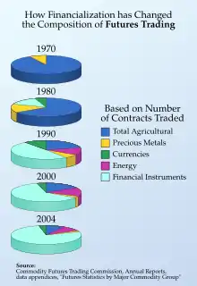 تستند بيانات التقلبات المالية في الأسواق المستقبلية في الأعوام 1970 و 1980 و 1990 إلى عدد العقود المتبادلة، والتي تُحدد من قبل التبادلات المنظمة مثل مجلس شيكاغو التجاري وسوق شيكاغو للتبادل التجاري ومؤسسة نيويورك للتبادل التجاري، وتوضع في ملحقات البيانات للتقارير السنوية إلى مفوضية تجارة السلع المستقبلية في الولايات المتحدة الأمريكية. يُظهر المخطط البياني في الأسفل التحول المفاجئ لأنماط العقود المستقبلية المتبادلة من عام 1970 إلى عام 2004.
