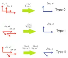للتوليد التوافقي الثاني ثلاثة أنواع يرمز لها بـ 0، I، و II. في النوع 0 يكون للفوتونين استقطاب استثنائي بالنسبة إلى البلورة، ويندمج الفوتونان ليكونا فوتونا واحدا له ضعف التردد (الطاقة) وباستقطاب استثنائي. في النوع I يكون للفوتونين استقطاب عادي بالنسبة إلى البلورة، ويندمج الفوتونان ليكونا فوتونا له ضعف التردد وباستقطاب استثنائي. وفي النوع II يكون للفوتونين استقطاب متعامد، ويندمج الفوتونان ليكونا فوتونا له ضعف التردد وباستقطاب استثنائي. ولأي بلورة ذات اتجاه محدد، لا يحدث إلا نوع واحد فقط من هذه الأنواع الثلاثة. وبشكل عام، يتطلب الحصول على النوع 0 وجود بلورة ذات تماثل طوري ظاهري، كبلورات نيوبات الليثيوم المستقطبة دوريا.