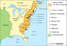 تَشكَّلت المُستعمرات البريطانيَّة الثلاثة عشر (الإنجليزيَّة الأصل) بين بداية القرن السابع عشر والثُلث الأول من القرن الثامن عشر، على امتداد عدة مئات من الكيلومترات على طول ساحل المحيط الأطلسي (انظر الخريطة). وتميّزت جغرافيتها وسكّانها واقتصادها ومؤسساتها بالاختلافات. كانت الاتصالات بين المستعمرات بطيئة وصعبة في كثير من الأحيان: كانت الطرق الموجودة في حالة سيئة ولم يكن هناك سوى القليل من الجسور [7].