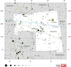 | ألمع نجم | الدبران (α Tau) (0.85قدر ظاهري) |
