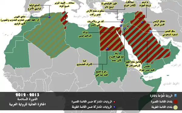 أعلن عن القائمة القصيرة وتضم ست روايات في تونس في يناير 2013، وأعلن الفائز في أبوظبي في 23 أبريل 2013 وهو الروائي الكويتي سعود السنعوسي عن روايته ساق البامبو[26] وهي تسجل كأول جائزة لدولة الكويت. وضمّت القائمة الطويلة والقصيرة، الروايات التالية:[27]