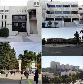 ![]() مِن يَمين الأعلى باتِّجاه عَقرب الساعة في الصورة: عمادة شؤون الطلبة، مكتبة الجامعة الأردنية، صورة للجامعة من شارع الجامعة، برج الساعة، ومبنى إدارة الجامعة. | ||||
