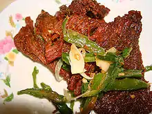 - دندن أو ناشف: شرائح رقيقة من اللحوم المجففة. تم حفظها بخليط من السكر والتوابل وتجفيفها من خلال عملية القلي. وهي أصلا تعود لشعب المينانغكابو.
