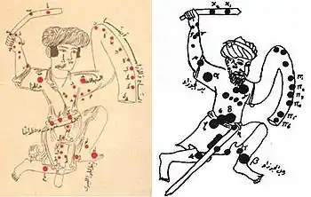 - كتاب "صور الكواكب الثمانية والأربعين"، لعبد الرحمن بن عمر الصوفي. ص264. نسخة مراجعة ومدقَّقة على نسخة الأمير "إلغ بيك كوركان"، من تحقيق لجنة إحياء التراث العربي في دار الآفاق الجديدة. الطبعة الأولى، بيروت عام 1981.