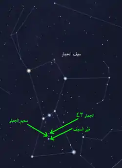 سيف الجبّار أو النّقط هو اسم كان يُطلقه العرب القدماء على ثلاثة أجرام تُشكل خطاً عمودياً يتدلّى تحت نجوم حزام الجبّار، وهذه الأجرام مُقسَّمة إلى ثلاثة مجموعات تبدو في السماء كثلاثة نجوم، هي: نجم الجبار 42 وسديم الرجل العداء، والنجم المتعدّد ثيتا الجبار المُسمَّى أيضاً تجمع المعين (الجبار 41 و43)، ونجم نير السيف (الجبار 44).[17][18] تبلغ أقدار هذه الأجرام: 5.5 (الجبار 42)[19] و4 (سديم الجبار)[20] و3.7 (تجمع المعين)[18] و2.75 (نيّر السّيف)،[21] وكون الأخير ألمعهم فقد سُمّي بالنيّر (وهي كلمة تدل على وضوح شيء وبروزه).[22] النجم الأول من فوق من نجوم السيف (الجبار 42) هو نجم مضاعف وساخن من نوع O6" يبعد عن الأرض ما يُقارب 240 سنة ضوئية.[19][21][23] وأما تجمع المعين فهو أحد أشهر النجوم المتعددة في السماء ويمكن رصده حتى بالمقارب الصغيرة، وهو يسمى "ثيتا 1" أو "الجبار 41"، ويرافقه نجم آخر هو "ثيتا 2" أو "الجبار 43" وهو نجم من نوع "O" أزرق ساخن.[18]