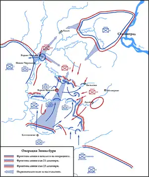 جنوبًا، اندفع الجيش الأحمر صوب إزيوم بمحازاة نهر سيفرسكي دونتس واستمر في التقدم لمسافة 100 كم (62 ميل) مكونًا نتوءًا عميقا في محاولة لمحاصرة مجموعة الجيوش الجنوبية الألمانية عند بحر أزوف، ولكن مع تحسّن أحوال الطقس ونهاية فصل الشتاء، نجحت القوات الألمانية في هجومها المضاد، مما أدى لهزيمة القوات السوفيتية في معركة خاركوف الثانية.
