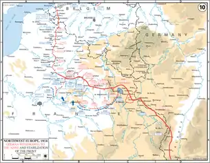 وصلت الخسائر التي تكبدها الفرنسيون في نهاية العام إلى 380 ألف قتيل و600 ألف جريح، وفقد الألمان عدداً أقل من ذلك بقليل، وبالرغم من ذلك لم يتفوق أي من الطرفين على الآخر.[24] وعندما أعاد الألمان محاولتهم للاختراق عند أيبر كانت جيوش الجانبين منهكة فلجأت إلى حرب الخنادق، فامتدت الخنادق من قرب الحدود السويسرية إلى المحيط الأطلنطي. وبهذا استطاعت حرب الخنادق أن توقف الهجوم وتحققت الورطة التي استمرت سنوات طوال. وينحصر تاريخ الجبهة الغربية لمدة ثلاث سنوات تالية في محاولات متتالية لقوات الحلفاء للخروج من تلك الورطة.