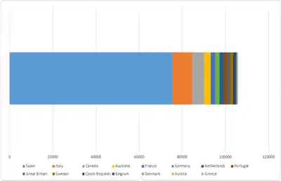 العدد التقديري للمهاجرين المصابين بالداء المثقاني الكروزي في البلدان الأوروبية.[5]