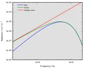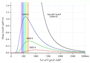 وقد أدت مسألة إيجاد الآلية التي تجعل طاقة إصدار الذرات للإشعاع الحراري موزعة على مختلف التواترات كما يشاهد تجريبيا إلى ولادة فيزياء الكم. ذلك أن كل المحاولات التي جرت في نهاية القرن التاسع عشر لتفسير هذا التوزيع الطاقي بالاستناد إلى المفاهيم الكلاسيكية بالاستعانة بالديناميكاالحرارية وقوانين الكهرومغناطيسيةالتي كانت سائدة في ذلك الوقت باءت بالفشل (قارن منحنى العلاقة الكلاسيكيه بالرسم).