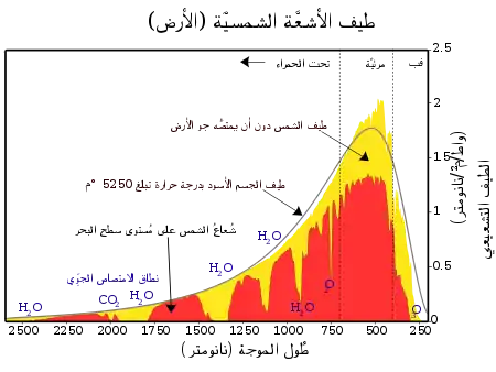 يبين الشكل المقابل (الإيطالي) طيف الشمس الذي التقطه أحد الأقمار الصناعية (باللون الأصفر) وهو ينطبق انطباقا جيدا على منحني بلانك من أول الطيف إلى آخره، وكلاهما يبين قمة للإشعاع بين موجة طولها 750 نانومتر ونحو 370 نانومتر، وهذا هو حيز الضوء المرئي. وتجري المقارنة في نفس الوقت بطيف الشمس الملتقط على سطح الأرض (باللون الأحمر)، ولايزال التطابق جيدا بينهم مع الفارق أن طيف الأرض يتعرض عند بعض أطوال موجة أشعته للامتصاص في جو الأرض، الشيء الذي يترك فيه بعض الفجوات وهي ناشئة في معظمها عن امتصاص بخار الجو لتلك الأشعة. كما نلاحظ أن الطيف الحراري للشمس ينتهي تقريبا عند طول موجة قدرها نحو 170 نانومنتر وهو تقريبا نهاية الأشعة فوق البنفسجية.