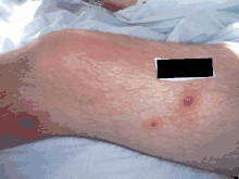 b) آفة عقدية بقياس 1 سم على الذراع. c) لويحات حمامية حويصيلية زائفة للجُلاد الحمامي الحاد بالعدلات على الذراع | |