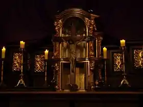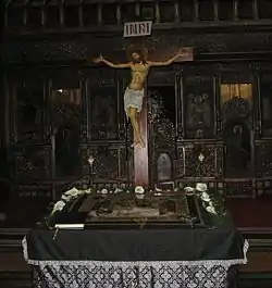 ![]() الصليب قبالة بين القربان الفارغ والمفتوح وغير المضاء بالنور، في حين نزع غطاء المذبح، وجميعها من علامات الحداد يوم الجمعة العظيمة في الكنيسة الرومانية الكاثوليكية. | |