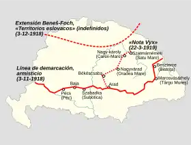 لكن الوفاق الثلاثي اعتبر المجر جزء من الملكية المزدوجة المهزومة، فحطم آمال المجريين بإيصال عدد من المذكرات الدبلوماسية المتعاقبة كل منها يطالب بتسليم المزيد من الأراضي إلى مجموعات إثنية أخرى. وفي 20 مارس 1919 أعطى الرئيس الفرنسي لبعثة الوفاق إلى بودابست لكارولي مذكرة الترسيم النهائي بعد الحرب العالمية الثانية الحدودلحدود ما بعد الحرب، الأمر الذي اعتبرته المجر غير مقبول،[12] مما جعل كارولي ورئيس الوزراء دينس برينكي في موقف لا يحسدون عليه، فقبول المذكرة الفرنسية من شأنه أن يهدد البلاد وسلامتها الإقليمية وفي الوقت نفسه لا يمكنهم رفضها ولحتجلجلً على هذا أعلن برينكي استقالته من منصبه.