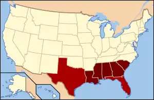 الولايات بالأحمر الغامق تمثل الجنوب العميق اليوم. المناطق المجاورة بالأحمر المتوسط تعتبر أيضاً من الجنوب العميق، تاريخياً هذه الولايات السبعة في الأصل كونت سابقاً الولايات الكونفدرالية الأمريكية.