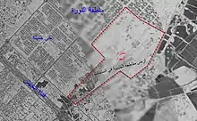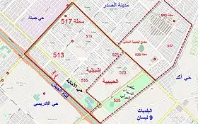 ![]() الخط الأحمر المتقطع هو حدود منطقة الحبيبية المتداخلة مع حي إشبيلية غرباً ومدينة الصدر شرقاً | |