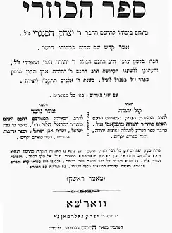 ![]() غلاف طبعة عام 1880 باللغة العبرية في وارسو من كوزاري. على الرغم من أن الحاخام في كوزاري غير مسمى ، إلا أن الغلاف يشير إلى إسحاق ها سانجاري. | |