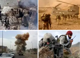 ![]() مع عقارب الساعة من الأعلى يسارا: ما بعد هجمات 11 سبتمبر؛ المشاة الأمريكية في أفغانستان؛ جندي أمريكي ومترجم أفغاني في ولاية زابل، أفغانستان؛ انفجار سيارة عراقية مفخخة في بغداد | |||||||||