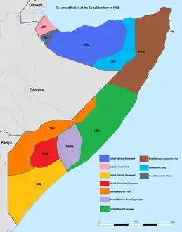 أصبح الصومال ثلاثة أقسام فرنسي وإيطالي وبريطاني استقل الجزءان الإيطالي والبريطاني عام 1960 وكونا جمهورية الصومال المتحدة واستقل الصومال الفرنسي عام 1977 مكونا دولة جيوبوتي حدث نزاع حدودي بين الصومال وكينيا عام 1963 وبين الصومال وأثيوبيا عام 1964 وقد تطور الأخير إلى نزاع مسلح لقد ظل الحلم الصومالي بوطن واحد لكل الصوماليين "الصومال الكبير" يراود أذهان الصوماليين في الفترة من 1977 حتى 1991 حدثت ثلاثة نزاعات مسلحة : الحرب ضد أثيوبيا 1977-1978 والقتال بين الحكومة والحركة الوطنية الصومالية في شمال غرب البلاد والنزاع بين الحكومة والقوات التحريرية العشائرية 1989-1990
