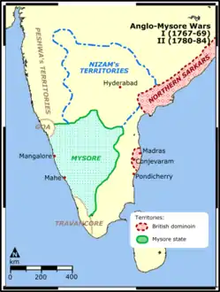 كان القرن الثامن عشر فترة اضطراب كبير في شبه القارة الهندية. على الرغم من أن القرن بدأ مع سيطرة الإمبراطورية المغولية على الكثير من شبه القارة، إلا أن وفاة الإمبراطور أوزنكزيب في عام 1707 أدت إلى تمزق الإمبراطورية، ونشوب صراع بين النواب والحكام المحليين الآخرين على الأراضي.[1] في الأربعينيات والخمسينيات من القرن الثامن عشر، أصبحت الشركات الاستعمارية الفرنسية والبريطانية أكثر نشاطًا في هذه الصراعات المحلية، وبحلول وقت قيام حرب كارناتيك الثالثة (1757-1763)، لم يكتسب البريطانيون موطئ قدم قوي إلى حد ما في مومباي ومدراس وكلكتا فحسب، إنما همشوا نفوذ القوى الاستعمارية الأخرى لكن دون أن يقضوا عليها. تأثرت ممتلكاتهم الشرقية في مدراس بشدة بالمعاهدات التي أُبرمت مع نواب كارناتيك، محمد علي خان الولجة، التي أحاطت أراضيه بمدراس. كانت القوى الرئيسية الأخرى في الشرق هي دولة نظام الملك حيدر أباد، الذي كان في السابق نائبًا لإمبراطورية المغول، لكنه أعلن استقلاله في عشرينيات القرن الثامن عشر، التي احتُلت في ستينيات القرن الثامن عشر من قِبل عساف جاه الثاني، وسلطنة ميسور، التي احتلت السهول العالية بين جبال الغات الشرقية والغربية، وهي سلاسل الجبال التي تفصل السهول الساحلية للهند عن الداخل. باعتبار أنها حُكمت من قبل سلالة وديار اسميًا، أصبحت السيطرة على ميسور في عام 1761 بيد حيدر علي، وهو قائد عسكري مسلم. كانت كل هذه القوى تتآمر بين بعضها وضد بعضها، وسعت إلى استجرار قوة الشركات الاستعمارية الفرنسية والبريطانية لخدمة أهدافها.[2] سعت القوى الاستعمارية للتأثير على السلطات المحلية إما لكسب السيطرة المباشرة على الأراضي، أو لكسب الإيرادات من الأراضي التي يسيطر عليها اسميًا حاكم محلي مدين بالفضل لهم مقابل الحصول على الدعم المالي والعسكري. بما أن التدريب العسكري الأوروبي كان أفضل بكثير من التدريبات المحلية، فإن الأخيرة كان لها أهمية خاصة أيضًا؛ يمكن لأعداد صغيرة من القوات الأوروبية المنضبطة أو المدربة على الطريقة الأوروبية هزيمة جيوش هندية أكبر عددًا بكثير مؤلفة بشكل رئيسي من المشاة وسلاح الفرسان المدربين تدريبًا سيئًا. [3]