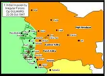 وفي 22 أكتوبر، تم إطلاق هجوم آخر في قطاع مظفر أباد. تمركزت قوات الإمارة في المناطق الحدودية في جميع أنحاء مظفر اباد ودوميل لكنها هزمت بسرعة من قبل القوات القبلية (بعضها من القوات الإسلامية المتمردة من الإمارة وبعضها انضمت لها) وأصبح الطريق إلى العاصمة مفتوحا. ومن بين المهاجمين، كان هناك العديد من الجنود النشطين في الجيش الباكستاني تحت إمرة القبائل. وقدمت لهم مساعدة لوجستية من قبل الجيش الباكستاني. بدلا من التقدم نحو سريناغار قبل قوات الإمارة التي يمكن تجميع صفوفهما أو تعزيزها، ظلت القوات الغازية تحتل المدن في منطقة الحدود وارتكاب جرائم نهب وجرائم أخرى ضد سكانها.[40] في وادي بونش، تراجعت قوات الإمارة من المدن حيث تمت محاصرتها.[41]