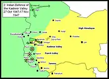 بعد الانضمام، نقلت الهند جوا قواتها مع معدات إلى سريناغار تحت قيادة اللفتنانت العقيد ديوان رانجيت راي، حيث عززت قوات الدولة الأميرية، التي أنشئت دفاعات على محيط المدينة وهزمت القوى القبلية في ضواحي المدينة. شملت أولى عمليات الدفاع، الدفاع الملحوظ عن بادغام للسيطرة على كل من العاصمة والمطار خلال الليل. تضمن الدفاع الناجح، مناورات الالتفاف التي قامت بها السيارات المدرعة الهندية[42] خلال معركة شالاتينغ. سعت القوات القبلية المهزومة إلى دخول بارامولا وأوري وهذه المدن كحد أقصى، لكن أيضا، تم احتلالها.