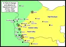 هاجمت القوات القبلية واحتلت جهانغير. ثم هاجمت ناوشيرا دون جدوى، وقامت بسلسلة من الهجمات غير الناجحة على أوري. في الجنوب، كان هناك هجوم هندي غير خطير لتأمين شامب. في هذه المرحلة من الحرب، بدأ خط الجبهة بالاستقرار كما أصبحت المزيد من القوات الهندية متاحة للخدمة.