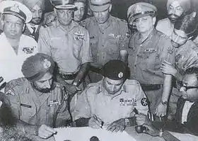 ![]() الفريق الباكستاني خان نيازي يوقع وثيقة الاستسلام في داكا في 16 ديسمبر 1971، بحضور الفريق الهندي جاغجيت سينغ أورورا. يقف خلفهم مباشرة من اليسار إلى اليمين: اللواء البحري في البحرية الهندية نيلاكانتا كريشنان، المشير الجوي في القوات الجوية الهندية هاري شاند ديوان، الفريق ساغات سينغ واللواء جاكوب فارج رافاييل جاكوب في الجيش الهندي (مع الملازم البحري كريشنامورثي وهو ينظر من فوق كتفه). الصحفي المحنك في راديو كل الهند، سوروجيت سين، وهو ينظر إليهم مع مسكه لميكروفون في اليمين. | |||||||||