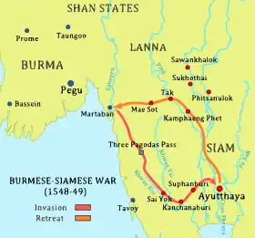 ادعي أن ذريعة الحرب هي محاولة بورما توسيع حدودها شرقًا عقب أزمة سياسية في أيوثايا،[1] والسعي وراء إيقاف توغل سيام نحو ساحل تانينثاري العلوي.[2][3] بدأت الحرب، وفقًا للبورميين، في شهر يناير من عام 1547 عندما احتلت القوات السيامية بلدة تافوي (داوي) الحدودية. في وقت لاحقٍ من ذاك العام، استعادت القوات البورمية تحت قيادة الجنرال ساو لغوان إين الساحل العلوي لتانينثاري وصولًا إلى بلدة تافوي. في العام التالي، وتحديدًا في شهر أكتوبر، غزا الملك تابينشويهتي ونائبه بينانغ كياوهتين ناورهتا برفقة 3 جيوش بورمية دولة سيام عبر ممر المعابد الثلاثة. شقّت القوات البورمية طريقها حتى وصلت إلى العاصمة، وهي مدينة أيوثايا، لكنها لم تستطع الاستيلاء على المدينة المحصنة بشدة. بعد شهر من الحصار، كسرت القوات السيامية وهجماتها المضادة الحصار، وطردت القوات الغازية. لكن البورميين خاضوا محادثات حول تأمين انسحاب آمنٍ لهم مقابل السماح بعودة نبيلين سياميين مهمين (وهما وريث العرش الأمير راميسوان والأمير تاماراشا أمير فيتسانولوك) أسرتهما بورما سابقًا.