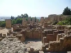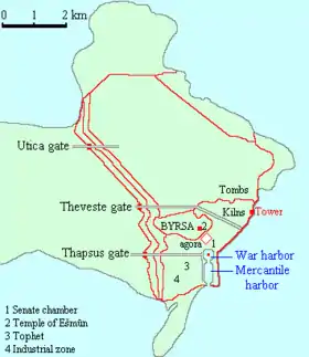 ![]() خريطة توضح دفاعات مدينة قرطاج خريطة توضح دفاعات مدينة قرطاج | |||||||