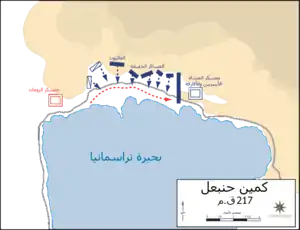وفي مضيق جبلي على شاطئ بحيرة تراسمانيا، صنع حنبعل كمينـا لجيش فلامينيوس. نجح هذا الكمين نجاحا كاملا في معركة بحيرة تراسمانيا، والتي قضى فيها حنبعل على معظم الجيش الروماني وقتل فلامينيوس نفسه، دون أن يتكبد القرطاجيون أي خسائر تذكر. تمكن 6,000 جندي روماني من الهرب، ولكن بعد ذلك استطاع ماهربعل وفرسانه النوميديين القبض عليهم وإجبارهم على الاستسلام.[32] أرسل سكيبيو فرسانه للدعم ولكن ألقي القبض عليهم أيضا وأبيدوا عن بكرة أبيهم. ونتيجة لهذا الانتصار، غنم الجيش القرطاجي المكون من الغاليين والأفارقة والأيبيريين والنوميديين من المعدات العسكرية شيء كثيرًا أكثر مما يمكنهم استخدامه بأنفسهم، فبيع الفائض إلى التجار المصريين الذي باعوه بدورهم إلى الرومان أنفسهم.