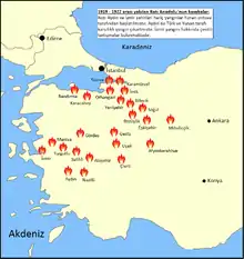 ذكرت العديد من الصحف الغربية تقارير عن انتهاكات جسيمة ارتكبتها القوات التركية بحق المدنيين المسيحيين اليونان والأرمن بشكل رئيسي.[65][66][67][68][69][70] ذكر المؤرخ البريطاني توينبي أن القوات التركية تعمدت إحراق العديد من المنازل اليونانية وصب البنزين عليها والتأكد من دمارها كلياً.[71] ظهرت مذابح على طول الفترة الممتدة بين سنة 1920 وسنة 1923، خلال حرب الاستقلال التركية، وخاصة من الأرمن في الشرق والجنوب، ضد اليونانيين في منطقة البحر الأسود. كما لوحظت استمرارية كبيرة بين منظمي المذابح بين سنة 1915 وسنة 1917 وسنتيّ 1919 و1921 في شرقي الأناضول.