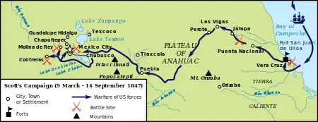 كان اللواء سكوت في هذا الوقت الضابط الأعلى رتبة في جيش الولايات المتحدة. في التاسع من مارس 1847م، نزل بقوة قوامها نحو 10,000 رجل بالقرب من فيراكروز. وبعد عشرين يومًا، استولى على المدينة، وفي أبريل بدأ تقدمه نحو العاصمة المكسيكية. اقتحم الجيش الأمريكي موقعًا جبليًا في سرّو جوردو في 17 و18 أبريل ثم واصل سيره. وبالقرب من مكسيكو سيتي حارب الجنود الأمريكيون في معركة كونتريراس وشوروبوسكو في 19 و20 أغسطس وانتصروا. كان الجيش المكسيكي متفوقًا في العدد، ولكنه للمرة الثانية، كان سيئ الإعداد والقيادة.