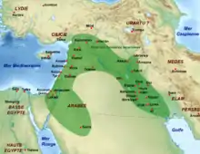 ![]() خريطة للإمبراطورية الآشورية الحديثة عام 824 قبل الميلاد (بالأخضر الغامق) وفي ذروتها عام 671 قبل الميلاد (بالأخضر الفاتح) تحت حكم الملك أسرحدون | |||||||