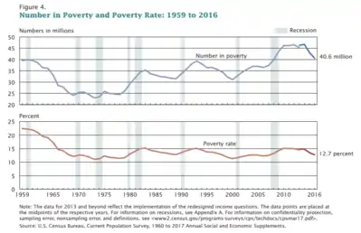 في عام 2004، اعتبر أكثر من 35.9 مليون شخص، أو 12 في المائة من الأمريكيين، منهم 12.1 مليون طفل، أنهم يعيشون في فقر بمعدل نمو يبلغ نحو مليون شخص في السنة. وفقا لمعهد كاتو، وهو مركز أبحاث تحرري، منذ إدارة جونسون، أنفق ما يقرب من 15 تريليون دولار على الرعاية الاجتماعية، مع معدلات الفقر هي نفسها تقريبا كما كانت في إدارة جونسون.[11] تؤكد دراسة أجريت عام 2013 نشرتها جامعة كولومبيا أنه بدون شبكة الأمان الاجتماعي، كان معدل الفقر سيكون 29 في المائة في عام 2012، بدلا من 16 في المائة.[12] وفقا لبيانات منظمة التعاون الاقتصادي والتنمية من عام 2012، بلغ معدل الفقر قبل الضرائب والمدفوعات التحويلية 28.3 في المائة، في حين انخفض معدل الفقر بعد الضرائب والتحويلات إلى 17.4 في المائة.[13]