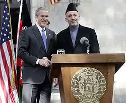 عُقد في يونيو 2002 ، لويا جيرغا (تجمع كبير) من قبل الملك السابق ظاهر شاه ، الذي عاد من المنفى بعد 29 عامًا. تم انتخاب حميد كرزاي رئيسًا لمدة عامين في جيرغا ، حيث تم استبدال السلطة الأفغانية المؤقتة أيضًا بدولة أفغانستان الإسلامية الانتقالية (TIS A ). عقدت لويا جيرغا الدستورية في ديسمبر 2003 ، واعتمدت دستور 2004 الجديد ، مع شكل رئاسي للحكومة ومجلس تشريعي من مجلسين. [92] تم انتخاب كرزاي في الانتخابات الرئاسية لعام 2004 ، يليه الفوز بفترة ولاية ثانية في الانتخابات الرئاسية لعام 2009 . وكانت كل من الانتخابات البرلمانية 2005 و 2010 ناجحة أيضا.
