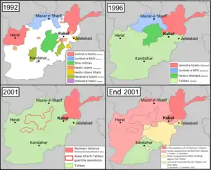 ![]() تطور الحرب في أفغانستان من اتفاق بيشاور في أبريل 1992 إلى معركة تورا بورا في ديسمبر 2001. | |||||||
