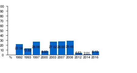 | السنة | عدد المصوتين | نسبة المصوتين | عدد النواب | التغيرات في عدد النواب | موقفه من الحكومة |