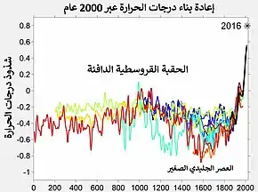 منحني بياني يظهر متوسط درجة حرارة سطح الأرض خلال الألفيتين المنصرمتين بالاعتماد على عدة مصادر.