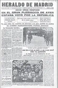 مع وصول أخبار إعلان الجمهورية من مدن مختلفة اجتمعت الحشود مساءا في مدريد في ميدان بويرتا ديل سول حيث مقر وزارة الداخلية، فذهب أعضاء اللجنة الثورية إلى هناك وعندما وصلوا إليها، ومن هناك دعا ميغيل مورا حرس بوابة الوزارة صارخا: "أيها السادة افسحوا لحكومة الجمهورية". إلا أن الحرس المدني كان واقفا عند ساحة المدخل ومبرزا أسلحته. وبعدها تحولت اللجنة الثورية إلى الحكومة المؤقتة للجمهورية وعينوا نيكيتو الكالا زامورا رئيسًا لها. كانت الساعة الثامنة مساء يوم 14 أبريل. في نفس الوقت ودَّع الملك نبلاء وكونتات إسبانيا الذين أتوا إلى قصر الشرق، ثم غادر مدريد بالسيارة متوجها نحو كارتاخينا، وفي الساعة الرابعة صباحًا استقل الطراد العسكري «أمير أستورياس» نحو مرسيليا[1]..