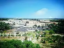 ترتفع أراضيها المنحدرة نحو الجنوب 35 متراً فوق مستوى سطح البحر، يسودها مناخ صحراوي يمتاز بقلة سقوط الأمطار وارتفاع درجات الحرارة صيفاً والتي تصل إلى 50 ْم، يسودها جو دافئ شتاءً.