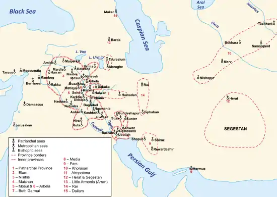 كانت الحيرة مقرًا لأسقفية كنيسة المشرق من القرن الرابع حتى القرن الحادي عشر م وكانت تابعة للمقاطعة البطريركية سلوقية - قطسيفون. اليوم هي أبرشية كاثوليكية اسمية-لقبية في العراق. شهد الحيرة لأول مرة توثيق أبرشية شرق سوريا فيها سنة 410 م، لكنها ربما كانت مؤسسة قبلها في القرن الرابع م. أصبح آخر أسقفها المعروف، يوحنان بار نازوك، بطريركًا في عام 1012.