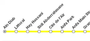 يمر خط الترامواي بأحياء سيدي مومن وحي مولاي رشيد عبر شارع عقبة بن نافع وشارع ابن تاشفين كما يمر عبر الحي المحمدي عبر شارع الشهداء وشارع الاوداية، وكذلك وسط المدينة والمرافق الإدارية عبر شارع محمد الخامس انطلاقا من ساحة الأمم المتحدة، حيث رسم مسار هذا الخط عبر شارع الحسن الثاني وشارع عبد المومن مرورا بأحياء مرس السلطان وسيدي بليوط والمستشفيات، وعند نهاية شارع عبد المومن بالمعاريف قرر مهندسو هذا الخط تفريقه إلى خطين الأول يمر عبر شارع أنوال والمشروع الجديد لأنفا ليصل إلى الحي الحسني عبر شارع سيدي عبد الرحمان وشارع أفغانستان ...