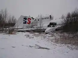بعد إقلاع الطائرة من مطار فنوكوفو في موسكو في الساعة 14:07 وخلال الصعود أصبح نظام الوقود يعمل بانقطاع ومن ثم رفض محركان ( الأولى والثالثة ) من الثلاثة، عملهما. قرر الطاقم بالهبوط الاضطراري في أقرب مطار - دوموديدوفو. وخلال عملية التخفيض رفض العمل كل من المولد ونظام الملاحة. وفقا للملاح استطاع أفراد الطاقم أثناء التخفيض، بتشغيل نظام الطاقة الثانوية واستعادة إمدادات الطاقة الكهربائية. في الظروف الجوية السيئة في الساعة 14:36 بتوقيت موسكو هبطت الطائرة هبوطا حادا إلى يمين مدرج “32ب” بـ 400 متر، عبرت المدرج وتدحرجت على الشريط الجانبي الأيسر الآمن وتواجهت بمنطقة وعرة وانهارت: انفصل الشاسي، واندلعت إلى النصفين، تضررت الواجهة الأمامية بشكل كبير. وتم تدمير تدمير الذيل. توقفت الطائرة حوالي 800 متر من نهاية مدرج 32ر و 150 متر على يسار المحور الطولي. الأحوال الجوية في وقت الكارثة: غائم جزئيا، وضوح الأرض 10 كم.
