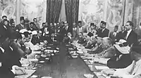 | مؤتمر سان ريمو | 19 نيسان (أبريل) 1920 - 25 نيسان (أبريل) 1920 | العالم العربي | بَحَث هذا المؤتمر معاهدة سيفر التي رسمت مستقبل المنطقة العربية، والتي تضم العراق وسوريا (بما فيها لبنان والأردن وفلسطين).[36] والتقسيمات والانتدابات حسب مصالح دول الحلفاء، بحيث تقسم سوريا الكبرى إلى أربعة أقسام: سوريا، ولبنان، والأردن، وفلسطين. وتكون سوريا ولبنان تحت الانتداب الفرنسي،[37] وفلسطين والأردن تحت الانتداب البريطاني بالإضافة إلى العراق.[38] |