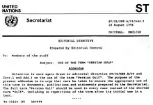 - التسمية الإنكليزية المقابلة : Persian gulf تستخدمها عدة دول أجنبية إضافة للأمم المتحدة إلا ان هناك استخدامات متبادلة للتسميتين حاليا
