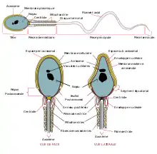 يتكون الحيوان المنوي من جزأين : الرأس والسطوة ، مفصولة بالياقة. يتميز بحد أدنى من السيتوبلازم . يمكن السوط من ضمان حركة الحيوانات المنوية وذالك بفضل مساره المنحني، وأيضا عن طريق دوران رأسه بمقدار 180 درجة.