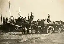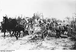 عملت آلاف الخيول لسحب المدافع الميدانية؛ حيث يحتاج كل مدفع من ستة إلى إثني عشر حصانًا لسحبه.[45] وخلال معركة كامبري، استخدُمت الخيول لجر المدافع التي استولت عليها القوات البريطانية من المنطقة المحرمة.[48] ساعدت الخيول والبغال في نقل الذخيرة وغيرها من اللوازم الحربية على عربات رغم الظروف السيئة.[44][49] كانت قيمة الخيول معروفة لجميع الأطراف المتقاتلة. ففي عام 1917، وفي معركة باسندال، أدرك الجنود في الجبهة أن فقدان حصان في هذه المرحلة أسوأ من فقدان رجل، لأن الرجال يمكن توفير غيرهم، أما الخيول فلا.[50] بالنسبة لبريطانيا، كانت الخيول ذات قيمة كبيرة لدرجة أنه إذا قتل حصان فارس أو مات، كان لزامًا عليه أن يقطع حافره وتسليمه إلى قائده لإثبات أنه لم يفقده.[51]