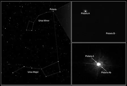 يسمى النجم القطبي الجدي (نجم) وبالإنجليزية Polaris. ويسهل التعرف عليه بواسطة كوكبة الدب الأكبر وذلك بمد خط وهمي من المراق (نجم) إلى الدبة (نجم) وحساب ستة أضعف المسفة بينهما فنجد النجم القطبي.