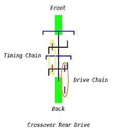 الحل الأقل شيوعًا هو تشغيل سلسلة محرك من العمود المرفقي الأمامي وصولاً إلى العجلة الخلفية، وأيضًا تشغيل سلسلة توقيت من العمود المرفقي الأمامي إلى العمود المرفقي الخلفي. هذا أقل شيوعًا لأنه يتطلب سلسلة أكثر بكثير من الترتيبين الأولين. يسمى هذا الإعداد محرك الأقراص الأمامي المتقاطع .